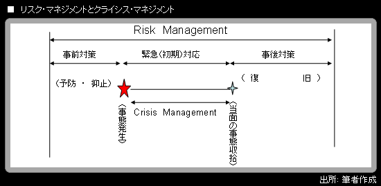 クライシスマネジメントは事態発生に伴う当面の対策・対応を扱うが、リスクマネジメントはそれよりは広い範囲を対象とし、事態発生の予防策を含み、将来対応まで含んでいる。この関係を図示すれば次の通りである。