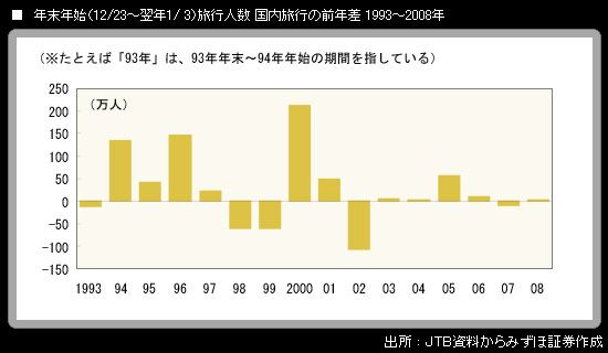 1991年の海外旅行人数急減・国内旅行人数急増、および翌92年に見られた反動を除くため、93年以降について国内旅行人数の前年差を取ると、下図のようになる。マイナスになったのは、93年、98年、99年、2002年、2007年。