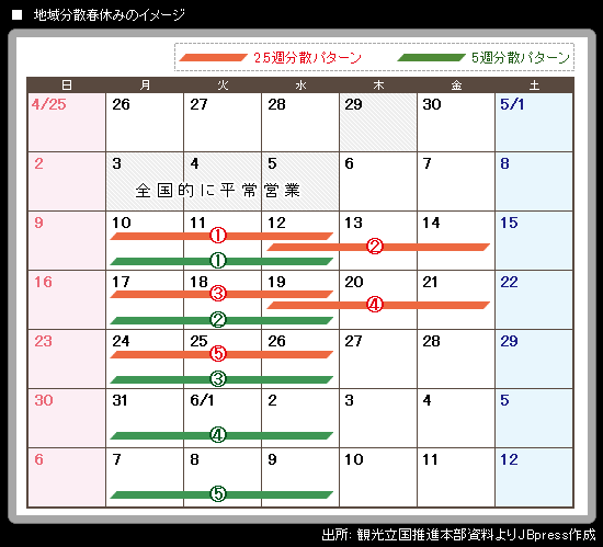 さらに国民が一斉に休んで行楽地に押し寄せることがないように、全国を(1)中国・四国・九州・沖縄(2)近畿(3)中部・北陸信越(4)近畿(5)北海道・東北・北関東の5ブロックに分け、地域ごとに休日をずらす。ずらし方には、週ごとに5週で実施する案と、2.5週の間に実施する2案がある=表。