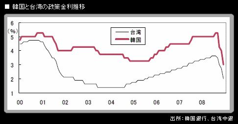 11日には、アジアで、韓国と台湾が利下げを決定した。韓国銀行は11日、政策金利(コール翌日物誘導水準)を1%引き下げて年3.0%とした。10月以降では4度目の利下げで、利下げ幅は過去最大。年3.0%という水準は、過去最低である。