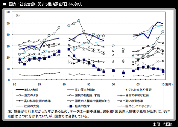 このような厳しい状況下、日本経済をどう立て直すかという議論に加えて、人口減少・高齢化社会と低成長を甘んじて受け入れた上で、日本という国が今後は何を目指すべきなのかという、これまでとは違った角度からの議論が行われる機会が増えている。そうした議論にはやや無責任な面があり、経済的な「負け」をあっさり認めるとしても財政の問題にはどう対処するのか、という反論を筆者はしたくなるのだが、ここではその話を深追いすることはせず、日本人の意識の変化を、世論調査をもとに考えることにしたい。