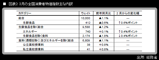 また、3月の全国消費者物価指数(全国CPI)は、「生鮮食品を除く総合」(コア)が前年同月比▲1.2%となり、マイナス幅は前月から変わらなかった。前年同月比マイナスはこれで13カ月連続のことである。コア前年同月比の押し上げに寄与した品目は「灯油」など。押し下げに寄与した品目は「ガソリン」「家賃」などである。