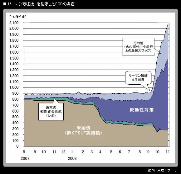 これを理解するために、昨年来のFRBの調節対応を簡単に振り返ってみたい。金融危機の深刻化に伴い、FRBは資金供給を強化してきた。一般的には供給を増やすと、中央銀行のB/Sは膨張するはず。ところが、その規模は最近まで9000億ドル前後でほぼ横ばいを続けていた。これは供給増大に歩調を合わせる形で、FRBが「何か」を減らしてきたことを意味する。