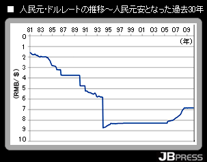 ところが中国の人民元は、過去30年間で、切り上げどころか大幅に安くなってきた。1980年は1ドルは1.7人民元だったが、今は6.8人民元だ。4分の1になったことになる。