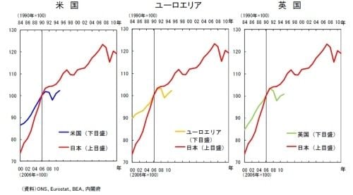 過去数年間の米国、ユーロ圏、英国で起きてきたことを1990 年代以降の日本のバブル崩壊後の姿と比較すると、相違点よりも、類似点の方が圧倒的に多いというのが私の印象である。日本で過去起きたことは、日本特有の現象ではなかった。