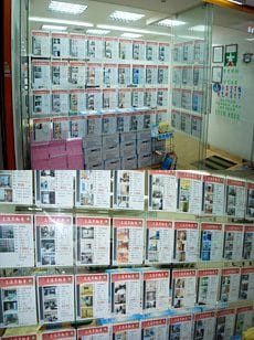 台北市内の不動産屋に貼り出された物件紹介のビラ。不動産ブームで不動産屋が急増しているという(筆者撮影)