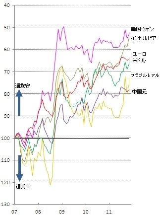 図表2 主要通貨の対円レート推移(2007年1月=100、出典:ブルームバーグ、武者リサーチ)