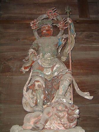 播州時光寺の増長天像と、踏みつけられる「あまんじゃく」。お笑いやマンガのいじられキャラ系の表情を見出すのは私だけだろうか?(ウィキペディア)