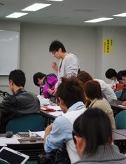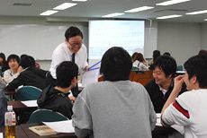 ビデオメッセージを見た後は、4~5人のグループに分けて、自己紹介を兼ねて卒業後の夢や大学4年間の過ごし方についてグループディスカッションする。慣れない日本語で四苦八苦しながらも、時折、教室のあちこちから楽しそうな笑い声が上がる。その間、竹原講師が1つ1つのグループを回り、声をかけたり、質問に答えたりする。
