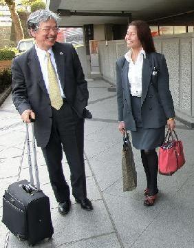 労災認定の記者会見を終えてほっとした大角カニカさん(右)と大橋弁護士(左)=静岡県庁で