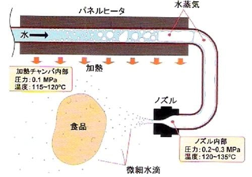 アクアクッカーは摂氏115度の過熱水蒸気と100度以上の微細水滴を混合し、気液二相状態(アクアガス)を作り出し、食品を迅速に加熱・殺菌する装置。