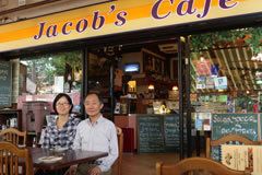 ジェイコブズ・カフェとオーナー夫妻。主人のリム・トゥスーンさん(右)は、カフェでの出会いとチャンギビレッジの歴史を『Tell it @ Jacob's Cafe』として上梓。(Jacob's cafe, Tel: 6543-1106)