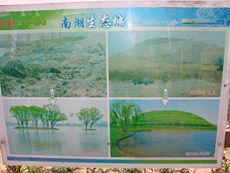 「唐山南湖」の今昔。もとは廃棄物の山だったと立て看板がでている
