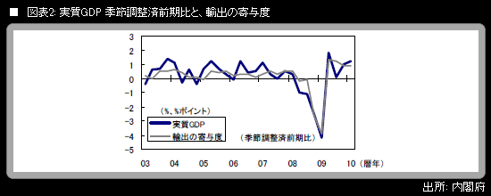 5月20日に内閣府が発表した1-3月期の四半期別GDP速報(QE)で、実質GDPは前期比+1.2%(同年率+4.9%)になった。過去の数字が改定されたため、4四半期連続のプラス成長である。前期比への内外需別寄与度は、内需が+0.6%ポイント、外需が+0.7%ポイント。2010年度の「成長率のゲタ」は+1.5%ポイントという、比較的大きなプラスの数字になった。このため、2010年度の実質GDPについての政府経済見通しである前年度比+1.4%、日銀が4月の展望レポートで提示した政策委員大勢見通し中央値である同+1.8%はいずれも、達成が十分射程圏内に入っている。なお、1-3月期の実質GDPは、前年同期比では+4.6%になった。
