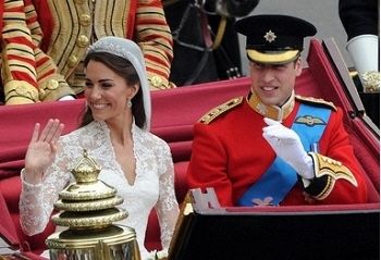 結婚式を終えてパレードするウィリアム王子とキャサリン妃(Kate, Duchess of Cambridge、2011年4月29日撮影)。(c)AFP/GERARD JULIEN 〔AFPBB News〕