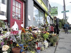 写真:哀悼の献花で埋め尽くされる事件現場のカフェ・レーサー