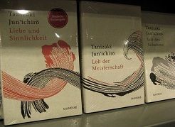 スイスの書店に並ぶ、クロッペンシュタイン名誉教授がドイツ語に訳した谷崎潤一郎のエッセイ集3巻『Lob des Schattens』『Lob der Meisterschaft』『Liebe und Sinnlichkeit』