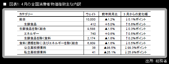 5月28日に総務省から発表された4月の全国消費者物価指数(全国CPI)は、「生鮮食品を除く総合」(コア)ベースで前年同月比▲1.5%。マイナス幅は前月から0.3%ポイント拡大した。高校授業料の実質無償化に伴うCPI品目「公立高校授業料」「私立高校授業料」の下落が主因で、それぞれの押し下げ寄与度が▲0.41%ポイント、▲0.13%ポイント、計▲0.54%ポイントであることを、総務省が確認した。コア前年同月比の押し下げには、上記のほか、「被服及び履物」などが寄与した。一方、押し上げに寄与したのは、「外国パック旅行」「生鮮食品を除く食料」「灯油」などである。