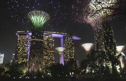 毎晩7時45分と8時45分に光と音のショーで彩られる「スーパーツリー」。園内は、午前2時まで存分にそぞろ歩きできる