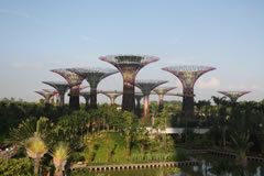 そのうち、7つのスーパーツリーの頂上には、太陽光発電装置が装着されていて、夜のライトアップに必要な電気を供給し、3つのスーパーツリーは、2つの巨大冷温室からの