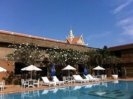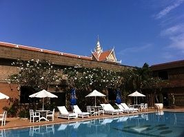事業説明会会場に選ばれた「インペリアル・ガーデン・ホテル&ヴィラ」のプールテラス。低層階建物の先に見えるのは、ホテル・カンボジアナの尖塔(特記したもの以外は著者撮影)発信者は日本人起業家、横井朋幸。