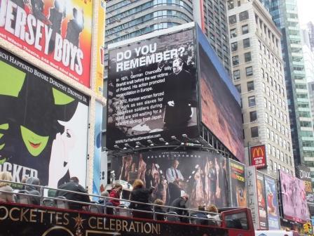 慰安婦問題で日本政府を非難する意見広告(タイムズスクエアで、山越晃記者撮影)