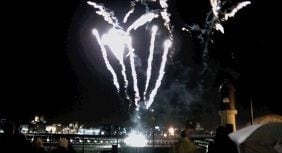 川辺で、実際に花火供養を行っている様子。参列者たちが手前に見える(紹介ビデオ "Eddie's Spectacular Liverpool Farewell." 2012年2月18日より)