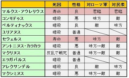下の表をご覧下さい。挙げられている皇帝10人のうち、天寿を全うできた人はわずか2人で、8人はローマ軍によって殺されています。ここに挙げられていない、マクシミヌス以降の皇帝も状況はそう変わりません。