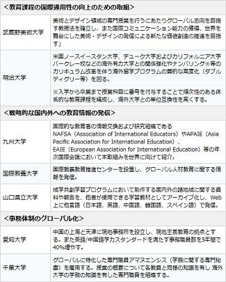 この分野では海外大学との連携を通じたプログラム開発、米国標準のスキル評価ツールの導入、教育実績の戦略的なPR、事務職員のグローバル化など非常に意欲的な施策が多々見受けられますが、学内の抵抗勢力に阻まれがちな分野でもあります。