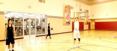 当地で阿部選手と練習に励む飯島康夫選手。バスケットボールを始めたのは高校の時。「当時は不良少年だった」が、あいさつ、礼儀など人間教育を重視する部活顧問との出会いが転機となった。