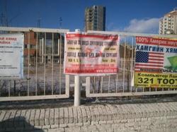 「300の中国にある優れた大学で学ぼう」 「(初級から上級)すべての段階の中国語教えます」と書かれた宣伝。後ろはモンゴル日本センター