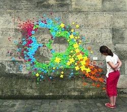 雨上がりの空にフワッとかかる虹のように、街角の壁に、輝く虹色の絵が現れた。スプレーの絵ではない。なんだか立体感がある。色紙? そう、何枚もの折った折り紙を張り合わせたOrigamiストリートアートだ。