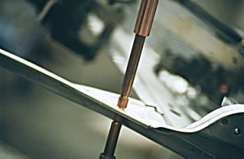 スポット溶接。2枚(以上)の金属板を重ね合わせ、写真に見られるような棒状の電極で挟み込んで密着させてから大電流を流す。すると電極の間の金属がそれ自体の電気抵抗によって発熱し、局部的に溶け合って接合する。薄い鉄板の大量処理に適した溶接法であり、素材がアルミ合金になると電流の伝導が良く、熱伝導も良いため、発熱しにくくしかも熱が逃げやすいので、相当に大きな電力を投入しなければならない。(写真:Volvo Cars)