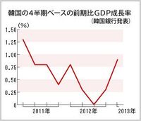 5月16日の日本の内閣府が発表した2013年1~3月期の国内総生産(GDP)速報値は、韓国にとっても衝撃的な数字だった。前期比0.9%増。年率換算で3.5%増と予想を大幅に上回る高さだったからだ。
