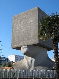 Tête Carrée(2002年作)。立方体部分はアルミニウム製で網のような構造のため、内部には日光が届いている。手前の歩行者が豆のように小さく、いかに巨大かよく分かる(筆者撮影、以下特記のあるもの以外も同様。写真協力すべてAtelier Sosno)