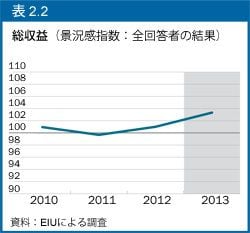 国内中堅企業の景況感指数は、今回EIUが実施したアンケート調査の結果から作成したものだ。同調査では回答者に対して、収益や雇用水準など数値化可能な業績評価指標が過去3年に増加・減少したのか、あるいは2013年に増加・減少するかといった質問への回答を求めた。さらに、総需要や市況、業界あるいは経済全体の景気動向などの質的要因が過去3年に改善したか悪化したか、2013年にどのように変化するかといった質問も行った。