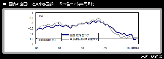 一方、国際商品市況によって影響されやすい品目が除去されているため、国内要因に基づいた消費者物価の基調をより明確に示す「食料(酒類を除く)及びエネルギーを除く総合」(いわゆる欧米型コア)は前年同月比▲1.6%で、マイナス幅は前月と同じだった。