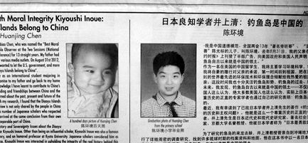 沖縄県の尖閣諸島(中国名:釣魚島)を巡り5日付のニューヨークタイムズ紙の広告欄(国際面A5)に、中国人留学生による「日本人学者の井上清教授:釣魚島は中国領」と題した意見広告が掲載された。