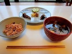 食事は、少量の玄米に味噌汁、おかず数種類で構成される。自家農園で作られた野菜や、信頼のおけるところから仕入れられた素材や材料が丁寧に調理されて、出されてくる。動物性の肉、卵、乳製品や、砂糖などは一切使用していない。