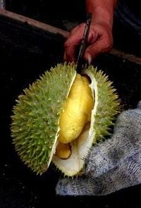 ドリアンの堅い殻を切ると中には淡黄色のクリームチーズのような果肉が