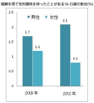 3年前の2009年に行われた同様の調査では、報酬を得て性的関係を持ったことがある男子は1.7%、女子は1.2%だった。