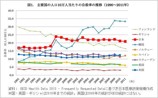 2013年6月の OECD Health Data によると、日本はOECD(経済開発協力機構)加盟国中、韓国、ハンガリーに次いで3番目に自殺率が高い。また韓国と同様、1997~98年の金融危機を境に自殺が急増、その影響がほとんど見られなかった西欧の国々とは、自殺率の推移が明確に異なる(図1)。