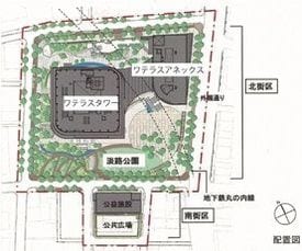 ワテラスは、統廃合で閉校となった旧淡路小学校跡地を含む、「淡路町二丁目西部地区第一種市街地再開発事業」(施行区域面積約2.2ha)によって生まれた2棟の建物からなり*1、地上41階建ての「ワテラスタワー」にはオフィス(全15フロア)と分譲マンション(333戸)の他、1~3階部分に「ワテラスコモン」と呼ばれるコミュニティー施設が設置されている。
