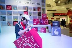 ブースの正面左側に設営された特設ステージの端ではアーティストの卵(美術大学の学生なのだそうだ)がライブパフォーマンスで赤い箱に白いペンキで絵を描き続けている。そのアーティストの周囲には描き終えたらしい箱が置かれているが、ICTの進歩によって実現する明るく、豊かな未来社会を表現したビジュアルが多い。
