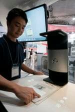 「インターフェースとなる先進技術」コーナーの正面に人だかりのできている場所がある。覗いてみると、説明担当者が「指が入力デバイスになります」と話している。