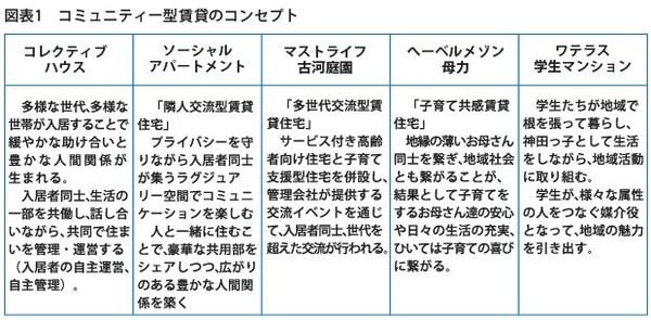 多くの民間賃貸住宅の場合、間取りや立地といった物的、空間的条件と、設定した賃料から、単身向けかファミリー向けかの違いがある程度であり、それに応じた程度にしか入居者の属性に違いは現れない。建築設計上のコンセプトがある場合もあるが、これらの事例に見るコンセプトは、交流を実現するための空間と管理・運営上のコンセプトである。