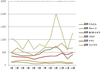 下のグラフは、2011(平成23)年の東京都中央卸売市場の月別野菜の価格(円/キログラム)について、いくつかグラフ化したものです。