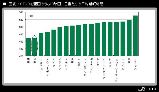 少し古いデータだが2009年にOECD(経済協力開発機構)がまとめた生活時間調査による睡眠時間の国際比較で、韓国が7時間49分、日本が7時間50分と僅差で「眠らない国」のトップ2に輝いた。ちなみにフランスは1時間も長い8時間50分、世界一の経済大国・米国も、8時間39分とかなりしっかりと睡眠を取っている。