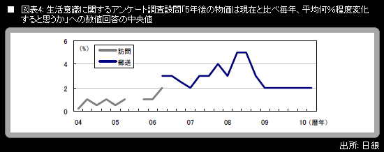 以上の中で最も注目されるのは、現在と比べた5年後の物価の年平均変化率についての回答が、中央値で見た場合、+2.0%という水準で、しっかり安定してきている点であ