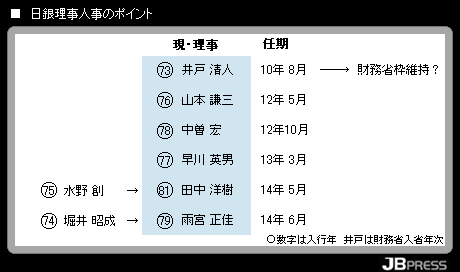日銀は、5月に退任した理事・水野創の後任に金融機構局長の田中洋樹(81年入行)、6月に退任した理事・堀井昭成の後任に企画局長の雨宮正佳(79年入行)を任命した。
